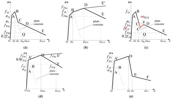Schematic diagram of stress–strain laws in MC2010 and MC2020 (see Table 1 for parameters). (a) Post-cracking bilinear model for FRC showing softening behavior in both MC2010 and MC2020; (b) Post-cracking bilinear model for FRC showing hardening behavior in MC2010; (c) Post-cracking trilinear model for FRC when is larger than 0.8 in MC2020; (d) Model when FRC shows hardening pre-peak behavior in MC2010; (e) Model when FRC shows hardening pre-peak behavior in MC2020.