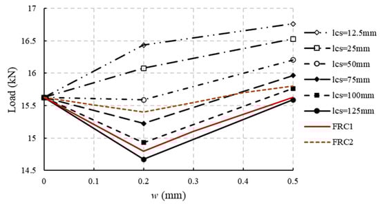 When the characteristic length becomes smaller, and if the constitutive parameters are still calculated according to the formulas in MC2020, this will result in an overestimation of the mechanical performance of FRC structures. Assuming an FRC with fR1 5MPa, and that the cracking load is the same as the load at a crack width of 0.5 mm (uniaxial tensile strength of approximately 2.94 MPa), with an elastic modulus of 34,500 MPa, the load-bearing capacity of FRC beams for different characteristic lengths can be derived according to Equations (1)–(3), as shown in Figure 7. In Figure 7, FRC1 and FRC2 are selected as test result curves for two types of FRC (as the load–crack width curves can have similar trends even though the fiber content is different because of the unevenly distributed fibers, we select two curves to analyze). As shown in Figure 7, as the characteristic length decreases, the load-bearing capacity of the beam gradually increases. If the load-bearing capacity first decreases and then increases during the test (FRC1 in Figure 7), the simulation results with smaller characteristic lengths (smaller element size) will show greater errors at crack widths less than 0.5 mm. In Chinese standards [34], the crack width in the SLS for general structures is usually limited to 0.2 mm. Therefore, using the models in MC2020 to simulate FRC structures will overestimate the performance in SLS.