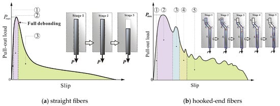 This study shows that the pull-out process of straight fibers can be divided into three stages (Figure 8a): the fully bonded stage, debonding stage, and the frictional sliding stage. In the fully bonded stage, the pull-out load increases linearly with slippage. As the load increases, interface damage occurs, and the fiber enters the debonding stage. During this stage, the load continues to increase, but the slip accelerates. The fiber reaches the maximum pull-out load in this stage. According to the test results in [15], the slippage is relatively small, about 0.2 mm, when the maximum pull-out load is reached. After complete debonding, the fiber enters the frictional sliding stage, where the pull-out load decreases rapidly but the slippage increases rapidly.