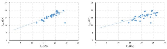 Fitting F1 and F2 with Fmin, as shown in Figure 10, indicates that Fmin can be linearly represented by either F1 or F2. However, the scatter figure of Fmin and F2 shows that the points are more dispersed. Although the correlation coefficients are close, the dispersion indicates that Fmin has a closer relationship with F1.