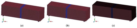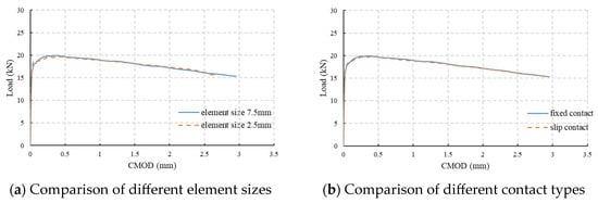 The notch width is around 2–3 mm in the tests. Therefore, it best matches the test conditions if the notch in the simulations is set to be 2–3 mm. However, this will cause more elements and make the simulations more time-consuming. To determine how the element size affects the simulation results, two models with different notch widths and mesh sizes are built: a notch width of 2.5 mm with an element size of 2.5 mm × 2.5 mm × 2.5 mm around the notch (far away from the notch, the element width is set to be 7.5 mm to reduce the number of elements), and a notch width of 7.5 mm with an element size of 7.5 mm × 7.5 mm × 7.5 mm. Only at the roller and below the notch, due to boundary size constraints, the mesh size slightly differs, but these are non-cracking elements and do not affect the simulation results. The simulations with a larger notch width are not considered as this is too far from reality.