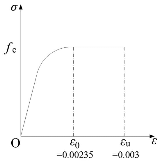 Regarding material constitutive models, the rollers are simulated using an elastic model with an elastic modulus of 2 × 105 MPa, while an elastic–plastic model is used for FRC. According to the test data, the compressive strength of the FRC is 77.54 MPa [36]. Referring to the “Code for Design of Concrete Structures” [34], the elastic modulus is set to 3.8 × 104 MPa. In the test, the concrete does not undergo crushing failure, so the ductility of FRC does not affect the test results. Therefore, the compressive constitutive model of plain concrete in the “Code for Design of Concrete Structures” [34] is used to simulate FRC under compression (Figure 12). The tensile constitutive model adopts the proposed post-cracking trilinear model, which has the same form as model No.3 in Table 1, with the value of α set to 1, and the stress at point C’ is treated as a variable for parameter analysis. The tensile constitutive parameters are detailed in Section 4.2. The stresses and corresponding strains at each characteristic point in the model curve are input in the numerical software to define the FRC constitutive model.