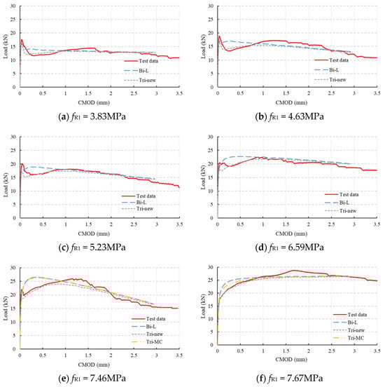 As shown in Figure 15a–d, the post-cracking bilinear constitutive model in MC2020 results in higher loads before the crack reaches 1mm. In contrast, the load–CMOD curves obtained using the proposed post-cracking trilinear constitutive model closely match the test curves, indicating that the proposed model can more accurately simulate the mechanical response of FRC at small crack widths, and the proposed calculation parameter is correct.
