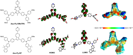 DFT and ESP images of Azu-Py-DF and Azu-Py-OMeTPA.