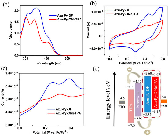 (a) UV–vis absorption, (b) CV curves, (c) normalized differential pulse voltammetry spectra, and (d) schematic diagram of the energy level arrangement of PSCs of Azu-Py-DF and Azu-Py-OMeTPA.