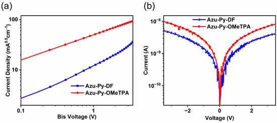 To further investigate the differences in charge transport properties of these HTMs, the hole mobilities of Azu-Py-DF and Azu-Py-OMeTPA were evaluated using the space-charge-limited current (SCLC) method; the adopted device structure is FTO/PEDOT:PSS/HTM/Au. Two devices, each with eight groups of data, were tested, and the final values represent the averaged data. The SCLC was determined using the following equation: J = (9/8)μεoεr(V2/D3), where μ is the hole mobility, εo is the vacuum permittivity (8.85 × 10−12 F/m), εr is the dielectric constant of the material (normally taken to approach 3 for organic semiconductors), V is the applied bias, D is the film thickness, and J stands for current density. As shown in Figure 3a, the hole mobilities were determined to be 3.16 × 10−5 cm2 V−1 s−1 and 1.47 × 10−4 cm2 V−1 s−1 for Azu-Py-DF and Azu-Py-OMeTPA, respectively, under the same conditions. It was observed that the hole mobility of Azu-Py-OMeTPA was significantly higher than that of Azu-Py-DF. For conductivity measurements, two devices with six sets of data were collected, and the final values were based on the averaged data. Two-probe electrical conductivity measurements were conducted to assess the electrical conductivities of the HTM films (Figure S2). The electrical conductivity (σ) was calculated by using the following equation: σ = W/(RLD), where L stands for the channel length (10 mm), W stands for the channel width (2 mm), D is the combined film thickness of the HTM and TiO2, and R is the film resistance value derived from the gradients of the curves. The conductivity of Azu-Py-OMeTPA was determined to be 5.01 × 10−5 S cm−1, higher than that of Azu-Py-DF (2.60 × 10−5 S cm−1). This improvement could be attributed to the optimization of the spatial configuration of Azu-Py-OMeTPA molecules upon the introduction of triphenylamine peripheral groups, which enhances solubility and improves thin film morphology. Nevertheless, both HTMs still exhibit lower mobility and conductivity than Spiro-OMeTAD (Table 1) [30], possibly due to persistent flaws in their thin film, as discussed below.