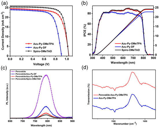(a) J–V curves and (b) IPCE spectra of PSC devices based on azulene-based HTM, (c) steady-state PL spectra of perovskite and perovskite/HTM films, and (d) infrared spectrum of Azu-Py-OMeTPA and the mixed sample of Azu-Py-OMeTPA/perovskite.