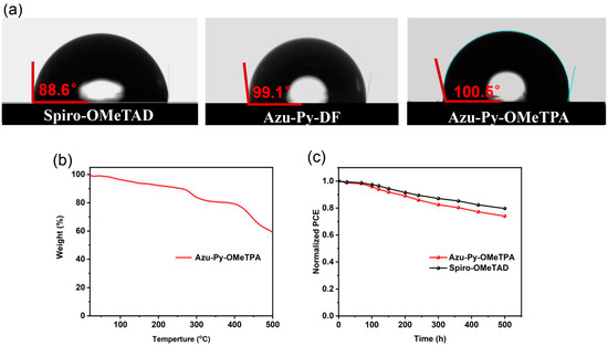 Contact angle measurements of Azu-Py-DF, Azu-Py-OMeTPA, and Spiro-OMeTAD, spin-coated onto perovskite thin films, are shown in Figure 6 to evaluate their hydrophobicity. The water contact angles were measured as 99.1° for Azu-Py-DF and 100.5° for Azu-Py-OMeTPA, both slightly higher than that of Spiro-OMeTAD (88.6°). This improved hydrophobicity may help mitigate perovskite degradation under certain humid conditions. However, thermogravimetric analysis (TGA) revealed that Azu-Py-OMeTPA exhibits a mass loss of less than 5% around 300 °C, indicating a lower thermal stability compared to Spiro-OMeTAD [32], suggesting greater sensitivity to heat. The long-term stability of the unpackaged devices under ambient conditions (RH 40–50%, room temperature) is presented in Figure 6c. The PSCs based on Azu-Py-OMeTPA maintained 74% of their initial efficiency after 500 h of aging, which is lower than that of Spiro-OMeTAD (80%) under the same conditions. This indicates that further studies are necessary to improve the stability of azulene-based HTMs.