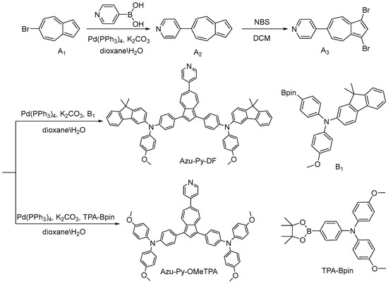 The chemical structures of Azu-Py-DF and Azu-Py-OMeTPA are shown in Figure 1, and their synthetic routes are depicted in Scheme 1. The 4-pyridyl group at the 6-position was first introduced via Suzuki–Miyaura coupling with moderate yields from commercially available 6-bromoazulene. Subsequently, electron-donating triphenylamine derivatives at the 1- and 3-positons were synthesized through bromination followed by Suzuki–Miyaura coupling, achieving good yields. Detailed synthetic procedures and characterization data for the intermediates and final products are provided in the Experimental Section, while the 1H NMR spectra are included in the Supporting Information. The two electron-donating peripheral triphenylamine derivatives were synthesized according to previously reported procedures [29,30].