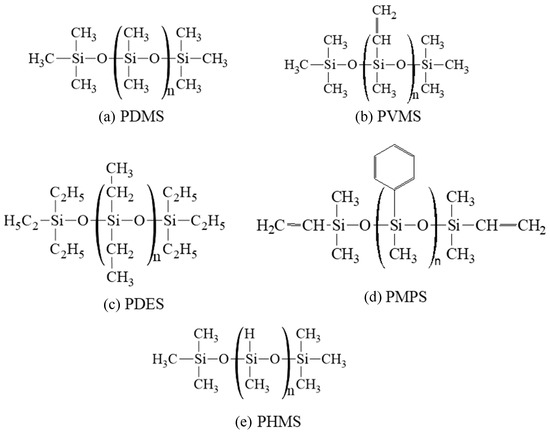Molecular structures of the five polymer precursors used in this study: (a) PDMS, (b) PVMS, (c) PDES, (d) PMPS, and (e) PHMS.