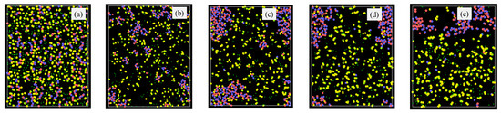 After reaching their peak temperatures, the systems were maintained at those temperatures for 2 ns while keeping the pressure constant at 2000 bar. During this period, gas species continued to be removed at 5 ps intervals. Following the holding phase, the temperature was gradually reduced back to 300 K over 0.5 ns, resulting in a total simulation time of approximately 2.75 to 3 ns. Throughout the heating process, bonding data were recorded every 5 ps, and atomic positions were continuously tracked. More details on ReaxFF simulation of the PSO pyrolysis to SiOC systems can be found in other references [26,28]. Compared to these earlier efforts, this study introduced several novel insights: (1) atomic-level insights into cluster separation, (2) first-time correlations between gas release and polymer molecular structures, (3) comprehensive analysis of pyrolysis conditions, (4) a new understanding of side group influence, and (5) first in-depth quantitative knowledge of early-stage pyrolysis.