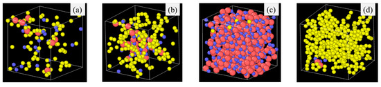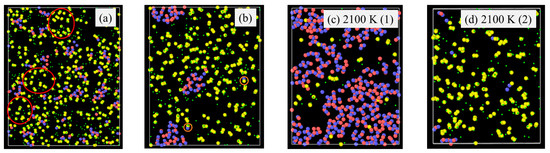 Pyrolysis temperature has a similar effect on the SiOC atomic structure evolution as the simulation time by affecting bond energies. For example, Si-H (~300–305 kJ/mol) and Si-C (~417–422 kJ/mol) have very different bond energy compared to that of Si-O bond (~780–785 kJ/mol) bonds [39,40,41]. The weaker Si–H and Si-C bonds break more readily, leading to the release of hydrocarbons and the separation of C from SiOx phases. In contrast, the Si–O bond, being significantly stronger, remains stable and contributes to the formation of Si-O clusters. A higher pyrolysis temperature leads to more Si-O and C domain separation, even though the extent varies, depending on the specific precursor system. To illustrate the specific changes, PDES is used as an example as shown in Figure 4. After 2 ns simulation time at 1500 K (Figure 4a), some Si-O clusters form and grow from being strand-like to being equiaxed. C-rich domains can be observed (red circles in Figure 4a). However, there is no large domain separation. Some Si-O clusters are still bonded to C species. At 1800 K simulation, Si-O clusters and C domains separate cleanly. There is no Si in the C domain, which has grown into a large region. Only very few O atoms are still bonded to C (as highlighted by the two small orange circles in Figure 4b). There are no C atoms in the Si-O clusters. With the simulation temperature increase to 2100 K (Figure 4c,d), almost complete Si-O separation from C occurs. Depending on the slicing plane in the 3D simulation volume, almost pure Si-O domains (Figure 4c) or pure C domains (Figure 4d) may be obtained. Figure 4c shows mostly Si-O clusters with a small number of C atoms scattered in between. Slicing farther into the Si-O cluster domain can result in pure Si-O compositions. In Figure 4d, it is mostly C species with a few Si-O clusters. The simulation also shows that a small amount of O atoms continues to bond with the C species. Again, slicing farther into the C cluster domain can result in pure C composition.