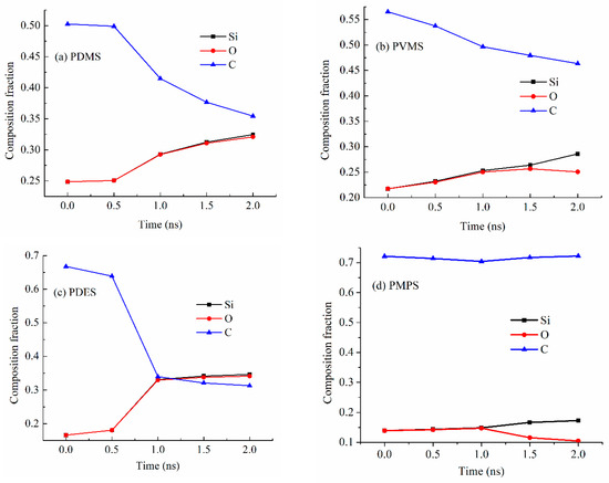 Compositions (atomic fractions) of the pyrolyzing (a) PDMS, (b) PVMS, (c) PDES, and (d) PMPS systems at different simulation time points at 2100 K.