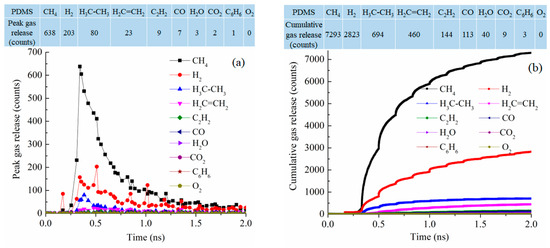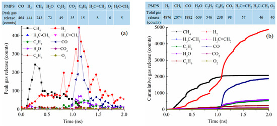 Gas release results for the PMPS pyrolyzing system at 2100 K: (a) peak gas release counts, (b) cumulative gas release counts.