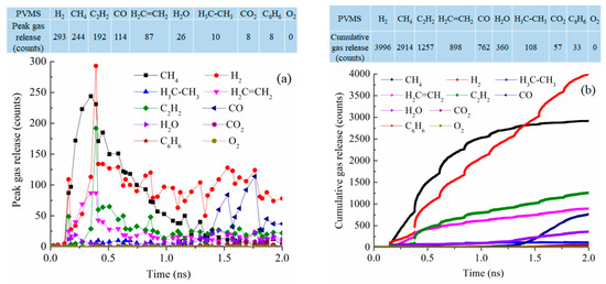 Gas release results for the PVMS pyrolyzing system at 2100 K: (a) peak gas release counts, (b) cumulative gas release counts.