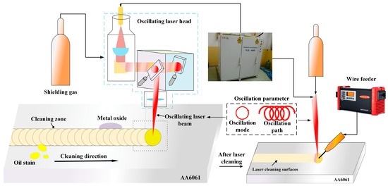 Aluminum alloy materials are extensively utilized in aerospace and various other industries. However, welding and additive manufacturing processes for aluminum alloy components are often challenged by high porosity and crack susceptibility [1,2]. Aluminum alloys are particularly prone to oxidation, and the presence of oxide films and other surface contaminants can significantly increase porosity and compromise weld quality [3,4,5]. Additionally, the welding or additive fusion wire process generates a substantial amount of metal oxides, often manifesting as post-weld “black ash.” Subsequent production processes can introduce serious defects, including porosity, cracks, and poor interlayer bonding [6,7,8]. Consequently, surface cleaning of the workpiece prior to welding is typically a mandatory step in the welding process specification. Traditional cleaning methods include mechanical and chemical cleaning. Mechanical cleaning involves the conversion of external energy, such as high-speed impact or mechanical friction, to remove surface contaminants. However, mechanical cleaning can reduce the volume of the additively shaped weld, thereby increasing energy consumption and decreasing the efficiency of additive fusion wire deposition [9]. Chemical cleaning employs cleaning agents to chemically treat the material surface, but improper handling can pose health hazards and cause irreversible environmental pollution [10]. Furthermore, both mechanical and chemical cleaning are typically performed offline, introducing cumbersome cleaning steps and increasing the risk of secondary oxidation in the cleaned area. Additionally, for multi-layer, multi-channel welding or additive manufacturing, the high-temperature weld with a fusion layer surface is more susceptible to oxidation. Mechanical or chemical cleaning must wait until the weld temperature cools to below 60 °C, thereby increasing the waiting time for welding operations and affecting the efficiency of subsequent layer deposition [11,12]. Therefore, to address the limitations of conventional cleaning methods, there is a critical need for a more efficient, environmentally friendly cleaning approach that can be implemented online.