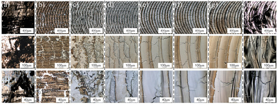 A 6061 aluminum alloy, which had not been subjected to welding contamination for an extended period, was selected for laser cleaning experiments. The laser cleaning speed was maintained at 3.6 m/min, and the remaining parameters are detailed in Table 4. Figure 2 illustrates the surface morphology of the material after cleaning at different laser power levels. When the material is not cleaned, there are a lot of scratches on the surface and black contaminants are attached. At a lower laser power of 1200 W, the high reflectivity of the aluminum alloy surface resulted in a visible white flash during the cleaning process, triggering a high anti-alarm response. Due to the insufficient power density to fully evaporate the surface contaminants, a significant amount of brown metal oxide layer remained observable on the material surface.