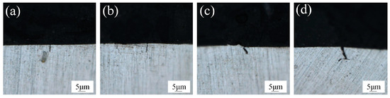 With a further increase in laser power to P = 3300 W, black pollutant particles are no longer produced on the edge swept by the oscillating laser. The material surface exhibits a silver-white metallic luster, and the oxides on the surface of the 6061 aluminum alloy are thoroughly removed. However, a wave-like morphology, similar to that observed after pulsed laser cleaning, is observed on the scanning edge. This phenomenon is attributed to the rapid flow of molten metal to both sides due to laser recoil following oscillating laser scanning, resulting in the formation of a wave-like shape. Upon further increasing the laser power, it is observed that the surface develops black folds and loses its metallic luster, transitioning from white to black. Analysis indicates that, at a laser power of P = 3900 W, excessive power leads to secondary ablation on the surface of the material surface, resulting in unclear surface morphology, severe oxidation, and poor cleaning effectiveness. As illustrated in Figure 2, when the laser power is increased to 2700 W, microcracks perpendicular to the oscillating laser cleaning path appear. The length and number of these cracks gradually increase with higher laser power. The formation of these cracks is analyzed as follows: first, unlike pulsed laser cleaning, which releases high-density heat in a very short time, continuous wave laser cleaning generates continuous heat on the material surface. Combined with the multiple thermal cycles of the oscillating laser, heat accumulation and temperature gradients induce significant thermal stresses, leading to surface cracks. Second, a thin oxide film forms on the surface of aluminum alloy over time. During laser cleaning, increased laser power can cause the oxide film to rupture, resulting in stress concentration and subsequent crack formation. The depth of cracks under different power levels was subsequently studied, as shown in Figure 3. With increasing laser power, the crack depth gradually increases. At P = 3600 W, flat bubbles are observed at the crack ends, which are presumed to be induced by porosity defects from the die-casting process of the plate. The measured crack depths range from 5 to 10 µm, comparable to the size of minor surface scratches. Laser cleaning does not affect the material’s usability, and these cracks are expected to heal during subsequent welding processes.