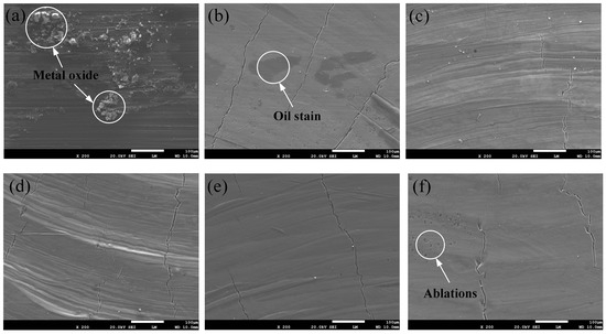 Cleaning effect under different laser powers in SEM: (a) unwashed; (b) P = 1200 W; (c) P = 2700 W; (d) P = 3000 W; (e) P = 3300 W; (f) P = 3600 W.