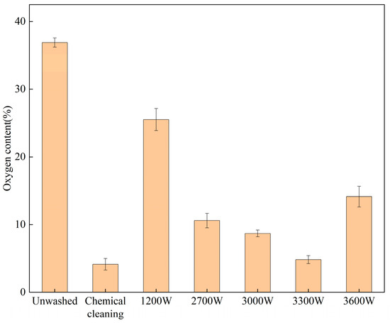 To evaluate the cleaning effectiveness under different parameters, a method for assessing cleaning effectiveness was established. This method involved observing the presence of any residual contaminants after cleaning using SEM and laser confocal microscopy, as well as analyzing changes in the oxygen content on the surface after cleaning using EDS. As illustrated in Figure 4, SEM images of the surface before cleaning and under different laser cleaning powers are presented. It is evident that when the material surface is not cleaned, it is densely covered with flocculent oxides and oil contaminants. However, when the surface is cleaned with a laser, these flocculent oxides and oil pollutants gradually disappear as the cleaning power increases, leaving no significant traces of residual contaminants on the surface. To further characterize the cleaning effect, the oxygen content of the chemically cleaned surfaces was analyzed using EDS, as shown in Figure 5, for both uncleaned surfaces and surfaces cleaned with different laser powers. The control group, consisting of uncleaned surfaces, exhibited an oxygen content of 37.45%. When the laser power was set to 1200 W, the oxygen content was 23.36%, indicating insufficient fragmentation to remove surface contaminants. As the power increased, the oxygen content on the surface initially increased and then decreased. At a power of 3300 W, the oxygen content was only 5.39%, slightly higher than that after chemical cleaning, representing the optimal cleaning effect. Compared to the control group, the oxygen content was reduced by 85.6%. With a further increase in laser power to 3600 W, the surface experienced slight ablation, and the oxygen content increased to 13.34%.