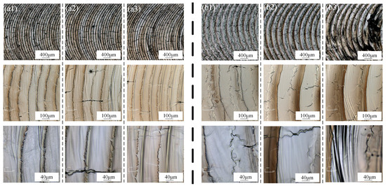 Surface quality under different cleaning speeds: (a1) v = 1.8 m/min P = 2700 W; (a2) v = 1.8 m/min P = 3000 W; (a3) v = 1.8 m/min P = 3300 W; (b1) v = 4.5 m/min P = 3000 W; (b2) v = 4.5 m/min P = 3300 W; (b3) v = 4.5 m/min P = 3600 W.