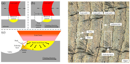 When the spot overlap ratio r > 50%, the previous scanning path is overlapped by the subsequent path due to the Gaussian distribution of the laser energy, as illustrated in Figure 7. During laser cleaning, the first path, shown in Figure 7a, results in the evaporation of the lower yellow portion of the material. When the laser is redirected to continue scanning, as depicted in Figure 7b, the distance between the two paths l represents the cleaning path spacing. If l is too large, the material surface may develop a hill-like undulation, with the highest points referred to as crests and the lowest points as troughs. The formation mechanism of these features is explained in Figure 7c. Due to the Gaussian distribution of laser energy, when the path overlap rate is low, the former scanning path does not fully cover the latter. As the material is heated to a molten state, the flowing liquid metal, influenced by the laser vapor recoil and protective gas flow, forms a pleated slip layer in the AC region. This layer acts similarly to isolation bands, collecting contaminant fragments after evaporation and fragmentation, resulting in the black strips observed in Figure 7d. During subsequent laser sweeps, the same principle applies, with the molten metal forming a pleated slip layer in the CD region, and so on. This process causes pollutants to accumulate in these areas, which is the primary reason for the formation of the black bands.