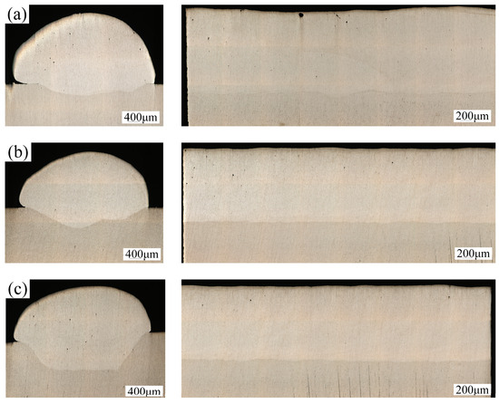 Weld cross-section morphology: (a) unwashed; (b) chemical cleaning; (c) laser cleaning.