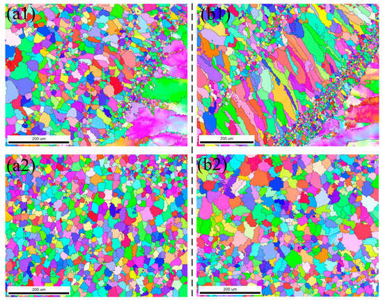 Grain distribution under two cleaning methods: (a1) Heat-affected zone under chemical cleaning; (a2) Weld center area under chemical cleaning; (b1) Heat-affected zone under laser cleaning; (b2) Weld center area under laser cleaning.