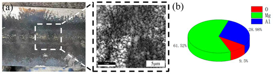 In the aluminum alloy welding process, surface contaminants frequently form on the weld. As illustrated in Figure 11, these contaminants appear as black particles distributed around the weld. EDS analysis reveals that the primary component of these particles is Mg, constituting 61.52% of the composition. Microscopic examination shows that the contaminants exhibit a flocculent, fluffy structural morphology.