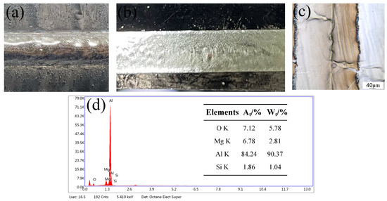 Cleaning effect of pollutants after welding: (a) surface after welding, (b) laser cleaning of surfaces after welding, (c) surface morphology after cleaning, (d) EDS analysis results.