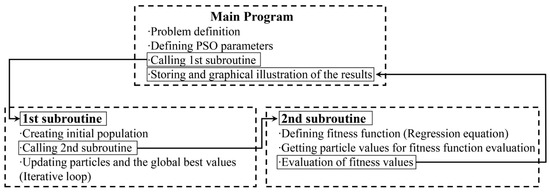 The initial position and velocity of each particle are randomly selected within the defined solution space. The target function value at each particle’s current position is calculated. This function is defined as the objective function of the optimization problem. The best position found by each particle (denoted as ) and the best position of the entire swarm (denoted as ) are identified. In PSO, the terms pBesti and gBest refer to the best solutions found during the optimization process: