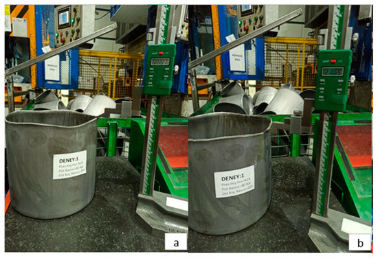 In Figure 9, the post-process images of the deep drawing process performed according to the process parameters of press descent speed, blank holder pressure and punch pressure set at 20%, 8 MPa and 22 MPa, respectively, are shown. As a result of the deep drawing process, the thinning amount in the upper region was determined as 3.94 mm and the thinning amount in the lower region was determined as 2.86 mm.