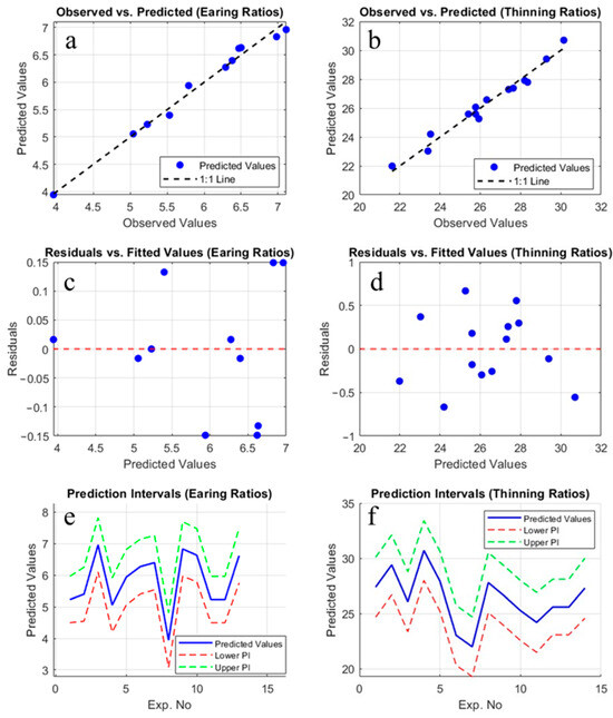 To enhance the accuracy and reliability of the model, the analyses conducted in this study were not limited to Minitab but were also re-executed using MATLAB 2024b software under the TU Delft license. During this additional validation process, the model was reconstructed and calculations were independently tested. The results obtained demonstrated consistency with the analyses performed using Minitab (Minitab 22.0, Minitab Inc., State College, PA, USA), thereby reinforcing the reliability of the model through verification via two different software platforms. This validation process strengthens the reproducibility of the model and the methodological robustness of the study, further supporting the validity of the findings. Figure 6 illustrates the model performance evaluation for earing and thinning ratios. The observed vs. predicted values (Figure 6a,b) highlight the model’s predictive accuracy and strong correlation. The plots of residuals vs. fitted values (Figure 6c,d) assess homoscedasticity and detect systematic residual patterns. Prediction intervals (Figure 6e,f) quantify uncertainty, with predicted values shown in blue and bounds in red and green.