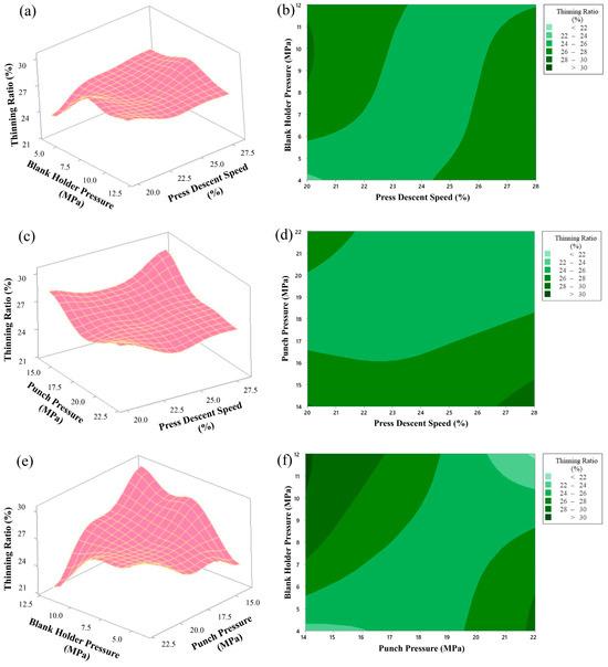 Surface and contour plots showing simultaneous effects of blank holder pressure, punch pressure and press descent speed on the thinning ratio, (a) 3D surface plot of thinning ratio as a function of blank holder pressure and press descent speed, (b) contour plot of thinning ratio as a function of blank holder pressure and press descent speed, (c) 3D surface plot of thinning ratio as a function of punch pressure and press descent speed, (d) contour plot of thinning ratio as a function of punch pressure and press descent speed, (e) 3D surface plot of thinning ratio as a function of blank holder pressure and punch pressure, (f) contour plot of thinning ratio as a function of blank holder pressure and punch pressure.