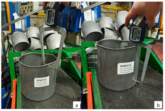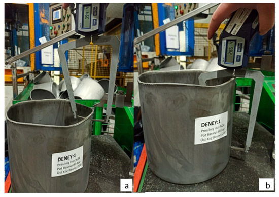 To determine the maximum and minimum height of a deep-drawn product, the process begins with a visual inspection to identify potential high points, followed by quantitative measurement using the gauge shown in Figure 1c. This process involves measuring the vertical distances on the side surfaces of the cylindrical sample to determine the amount of earing. The measurement part of the gauge is brought into contact with the highest point of the product. The product is then rotated 360 degrees to check if there is a point higher than the one identified. This way, the maximum height (hmax) is measured. On the other hand, to determine the minimum height (hmin), the measurement point of the gauge is touched to the shortest point of the product (the area where elongation is visually the least). The product is again rotated 360 degrees to find the lowest point.