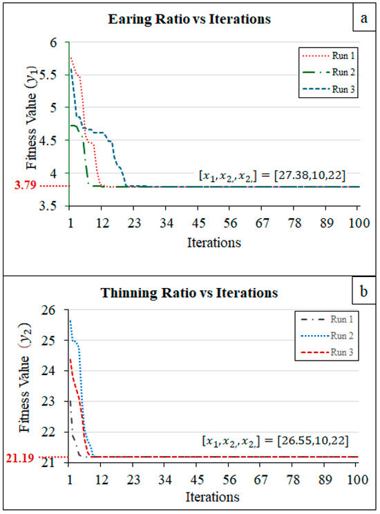 The earing ratio, a metric indicative of the process’s quality or efficiency, exhibited a general downward trajectory across all three runs as the iteration count increased. This trend suggests convergence towards an optimal solution. However, the rate of this decline varied among the runs. Run 1 demonstrated the most rapid decrease, while Run 3 exhibited the slowest. The final earing ratio attained is 3.79 for all runs (Figure 10a).