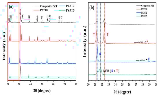 (a) XRD patterns of PZ8T2, PZ5T5, PZ2T8, and composite PZT powders in the 2θ range of 20–80°, with the region from 20° to 30° highlighted for detailed analysis. and (b) PZ8T2, PZ5T5, PZ2T8, and composite PZT powders in the 2θ range of 20–30° (* is TiO2; # is PbO).