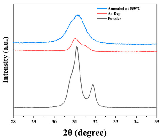 To evaluate the effect of post-deposition annealing on crystallinity, the XRD patterns of PZT powder, as-deposited AD film, and annealed PZT thick film at 550 °C are compared in Figure 2. The peaks observed between 30° and 33° highlight the changes in crystallinity before and after annealing. The as-deposited AD film shows an amorphous tendency with reduced crystallinity, primarily due to structural distortion caused during the AD process. This distortion arose from the high-speed impact of particles during deposition, which prevents proper crystal recovery and alignment. After annealing the composite PZT film at 550 °C, a significant increase in peak intensity can be observed in the XRD pattern, indicating increased crystallinity. The thermal energy supplied during the annealing process effectively relaxed the distorted crystals, aligned the crystal structure, and stabilized the overall crystalline framework [8].
