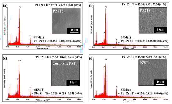 Figure 3 shows the EDX elemental composition analysis of annealed PZT films and standard error of measurement (SEM). The EDX spectra of (a) PZ5T5, (b) PZ2T8, (c) composite PZT, and (d) PZ8T2 films after annealing at 550 °C confirm the presence of Pb, Zr, Ti, and O, with elemental ratios closely matching the theoretical composition. In (a), (b), and (d), the quantified elemental composition of each film demonstrates that the PbO, ZrO2, and TiO2 ratios remained consistent after deposition and annealing. In (c), the EDX analysis of the composite PZT film, synthesized by mixing the three compositions, shows a uniform elemental distribution, aligning with the expected stoichiometry.