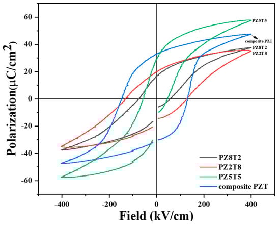 Polarization–electric field hysteresis loops of film types PZ5T5, PZ2T8, PZ8T2, and composite PZT compositions fabricated by aerosol deposition method (measured at 100 Hz).