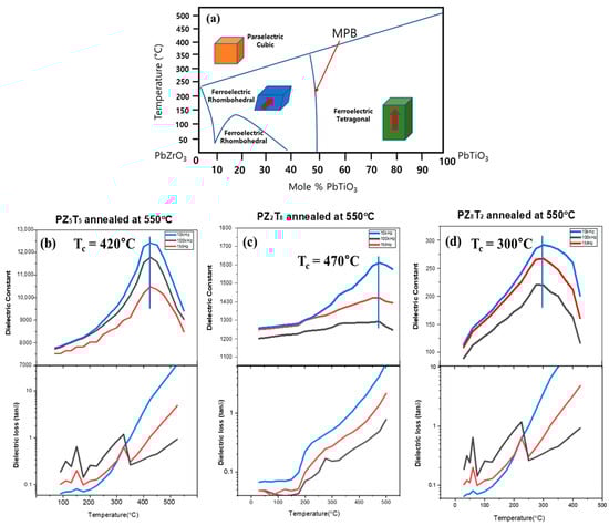 (a) PZT phase equilibrium diagram and dielectric coefficient and dielectric loss of (b) film-type PZ5T5, (c) film-type PZ2T8, and (d) film-type PZ8T2 as a function of temperature at various frequencies, all fabricated using the aerosol deposition (AD) method and annealed at 550 °C.