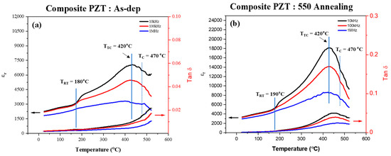 Figure 7 compares the dielectric coefficient (εr) and dielectric loss (tan δ) of the composite PZT films before and after annealing at 550 °C, showing how they change as a function of temperature.