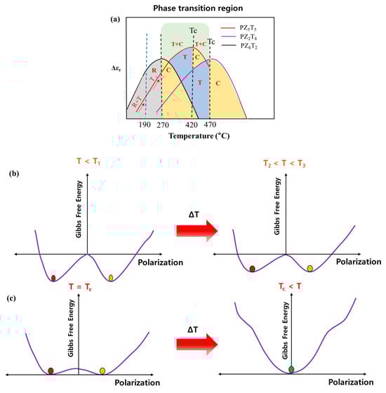 Figure 8b illustrates the phase-transition process in PZT with a single composition near the morphotropic phase boundary (MPB). At T1 (~200 °C), the phases coexist (rhombohedral and tetragonal), contributing to the overall dielectric response. The Gibbs free energy landscape exhibits two distinct local minima, representing the stability of the two coexisting phases. As T2 (the temperature increases beyond T1) starts, the overlapping phases are reduced by one, and the one phase (tetragonal) becomes dominant [12].