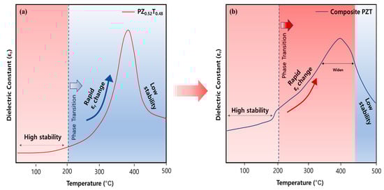 Lead zirconate titanate (PZT: PbZrxTi(1−x)O3) is a material of great interest due to its remarkable property enhancements in the morphotropic phase boundary (MPB) region, making it highly suitable for various applications. In the MPB region, tetragonal and rhombohedral phases coexist, maximizing interactions between the phases. Notably, polycrystalline PZT ceramics near the MPB composition of x ≈ 0.52 exhibit maximum dielectric permittivity and electromechanical coupling coefficients, which enhance their potential for use in diverse applications, such as piezoelectric transducers, pyroelectric detectors, and non-volatile memory devices [1]. It maintains a relatively stable dielectric coefficient up to approximately 200 °C; however, beyond this temperature, a phase transition occurs within a narrow temperature range, causing a sharp increase in the dielectric coefficient and pronounced temperature dependence. Analyzing the temperature-dependent permittivity data of conventional PZT bulk reveals the following trends. In the temperature range of 25 °C to 200 °C, prior to entering the phase-transition region, the permittivity increases relatively moderately, with a change rate of approximately 15%. However, in the range of 200 °C to 300 °C, approaching the phase-transition region, the permittivity increases sharply, resulting in a significant change rate of around 86%, which coincides with the rhombohedral-to-tetragonal phase transition, further intensifying permittivity variation. Particularly, in the range of 300 °C to 350 °C, as the material enters the phase-transition region, the permittivity change rate dramatically rises to approximately 107% [2]. This rapid change in permittivity reflects the structural transformations and sensitivity of domain alignment within the phase-transition region. Despite the high absolute values of permittivity, the excessively large relative change rate with temperature imposes limitations on its reliability for the broad temperature range. Therefore, strategies to suppress or stabilize the permittivity change rate in the phase-transition region are essential for improving the practicality of these materials with thermal stability. Therefore, the key is to maintain high permittivity over a wide temperature range, even at high temperatures where phase transitions occur, while minimizing the variation in permittivity with temperature.