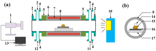 Schematic of the experimental setup (a) and side view of the test state in the furnace (b). 1—camera; 2—quartz window; 3—gas inlet; 4—sealing cover; 5—flange; 6—refractory; 7—heating element; 8—corundum furnace tube; 9—gas outlet; 10—light source; 11—thermocouple outlet; 12—Pt wire outlet; 13—PC and monitor; 14—cylindrical slag; 15—slag drop; 16—SiC substrate; 17—corundum carrier.