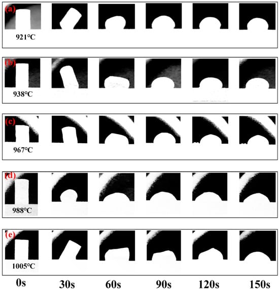 Wetting process between aluminum slag and SiC substrate with different Al2O3 contents: (a) 0 wt% Al2O3; (b) 5 wt% Al2O3; (c) 10 wt% Al2O3; (d) 15 wt% Al2O3; (e) 20 wt% Al2O3.