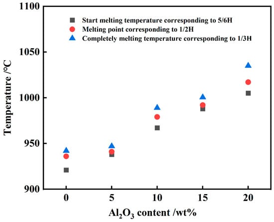 Figure 4 illustrates that as the slag spreads across the substrate, its height decreases while its diameter increases with temperature. Notably, there is significant variability in the slag’s morphological transformation across differing content ratios due to varying melting points. Liu et al. [] emphasized that t the ratio of substance contents significantly influences the slag’s melting point. Consequently, it is essential to determine the melting temperatures of slags with varying Al2O3 concentrations. In this investigation, the hemispherical point temperature was designated as the slag melting point, with the temperature ranges corresponding to 5/6 and 1/3 of the slag’s original height (denoted by H) regarded as the melting temperature spectrum. Figure 5 illustrates the effect of Al2O3 content on the starting melting temperature, melting point, and complete melting temperature of slag. The figure indicates that slag with a higher Al2O3 content exhibits a higher melting point and a broader melting temperature range. This occurs because, firstly, Al2O3 is a substance with a high melting point, and increasing its content in the slag raises the melting point to a certain degree. Secondly, Al2O3 contributes to the formation of more aluminosilicates, which have high melting points, thereby continuously elevating the various temperatures of the slag during the wetting process.