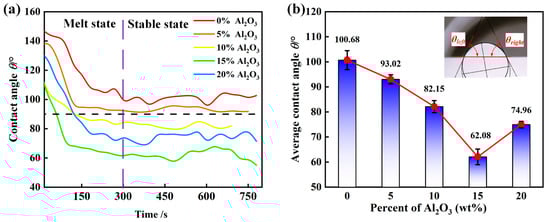 (a) Variation in the contact angle between slag and SiC substrate with holding time shows the trend; (b) Change of average contact angle with alumina content.