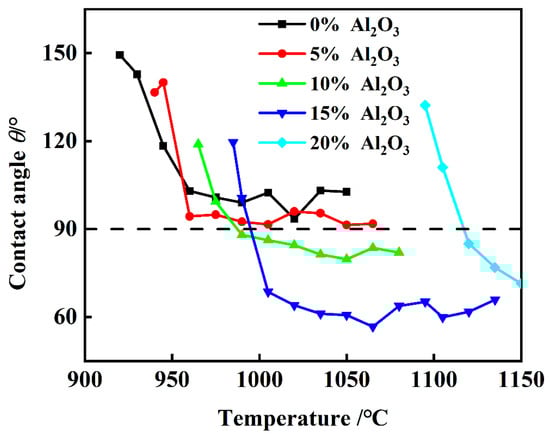 Figure 7 shows a visual representation of the variation in the contact angle between the aluminum slag and silicon carbide substrate as a function of increasing temperature. Typically, a contact angle of less than 90° indicates the transition of the slag and substrate into a wetting state. The 1# and 2# slags, with 0 wt% and 5 wt% Al2O3 content, exhibited contact angles of 102.44° and 91.6°, respectively, at 1000 °C, both of which remained greater than 90°, indicating that they did not wet the substrate throughout the heating process. In contrast, the 10 wt% (3# slag) and 15 wt% (4# slag) Al2O3 contents entered the wetting state with the SiC substrate before reaching 1000 °C. The 5# slag, containing 20 wt% Al2O3, did not melt at 1000 °C and thus failed to wet the SiC substrate. The 2# slag (5 wt% Al2O3) transitioned to wetting at approximately 950 °C, while the 3# slag (10 wt% Al2O3) reached this state around 980 °C, the 4# slag (15 wt% Al2O3) did so post-1000 °C, and the 5# slag (20 wt% Al2O3) at around 1120 °C, the earliest time at which it wetted the substrate. In this study, we report the contact angles of aluminum slag on SiC-based refractory materials, which are influenced by the Al2O3 content in the slag. We found that increasing the Al2O3 content leads to decreased contact angles, indicating improved wettability. However, discrepancies arise when comparing our results with those of studies that focus on different slag compositions or experimental setups. For instance, studies using higher Al2O3 concentrations (>10 wt%) report significantly different contact angles compared to industrial compositions (typically around 2.5 wt% Al2O3). This highlights the importance of using industrially relevant compositions in this study. Generally, the contact angle between the slag and the SiC substrate decreased with increasing Al2O3 content and temperature.