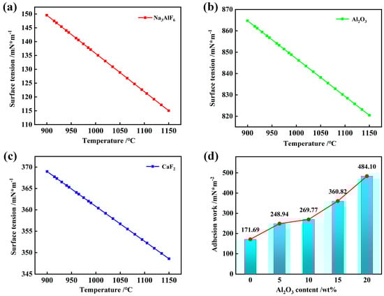 Effect of Al2O3 content on surface tension and adhesion work between aluminum slag and SiC substrate. (a–c) Variation of surface tension of each component of slag with temperature; (d) change in adhesion work with alumina content.